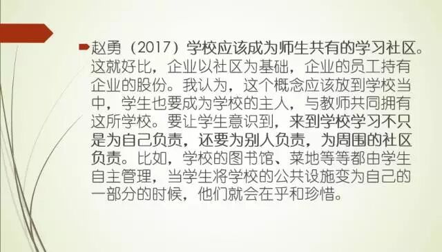赵勇认为,学校应该成为师生共有的学习社区。要让学生意识到,来到学校学习不只是为自己负责,还要为别人负责,为周围的社区负责。
