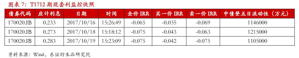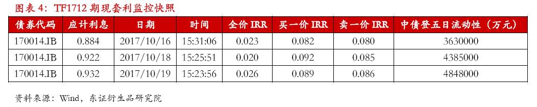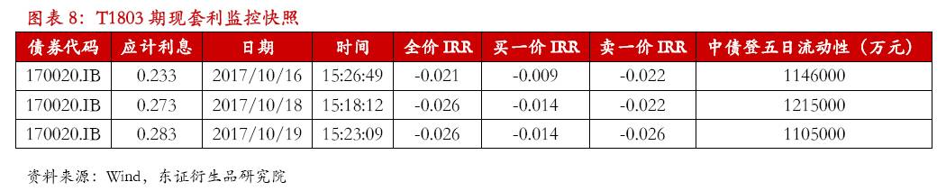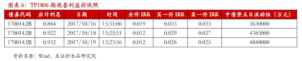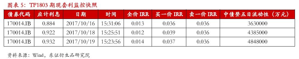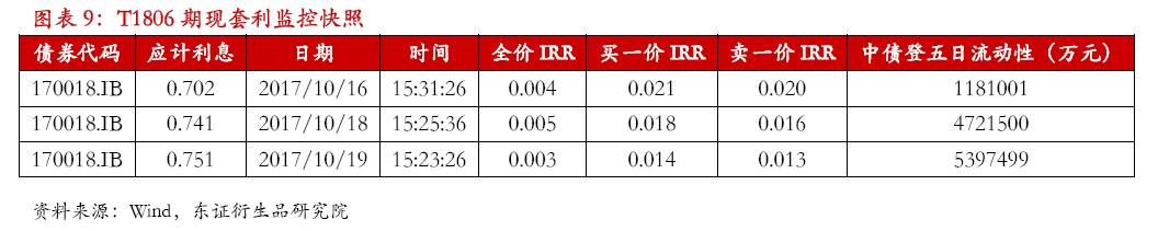 理论上讲,IRR大于资金成本和交易成本之和的情况下,可以买入现货,然后做空期货锁定收益,待交割即可获得超额收益。策略的操作难点是现货的获取和成本控制。图表中“中债登五日流动性”是五日中债结算笔数与中债平均每笔结算金额的乘积和,是计算银行间债券流动性的指标。