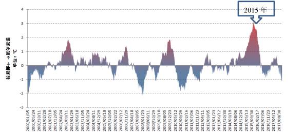 从上图我们可以看到截止到2017年11月22日的一周,SSTA已经连续将近7周低于-0.5℃。通常情况下,拉尼娜一般会出现在“厄尔尼诺”之后的第二年,有时拉尼娜现象会持续两、三年,在2015-2016年度中发生了较为严重的厄尔尼诺现象,因此应当继续重点关注2017-2018年度可能产生的拉尼娜现象。