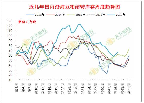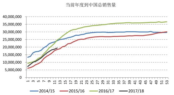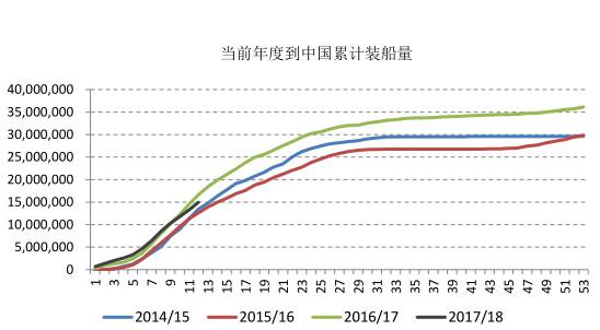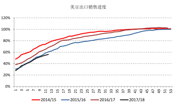 截止至11月23日,17/18年度美豆累计销售3439.5万吨,完成全年预估的56.17%,处于近四年来的偏低水平。