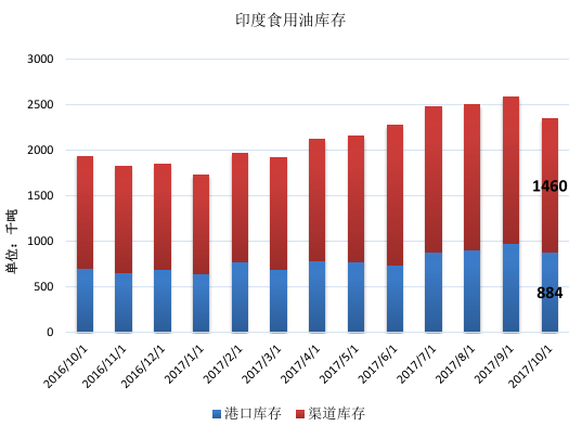 截止至11月1日,印度食用油港口库存88.4万吨,渠道库存146万吨,合计234.4万吨,较上月的258.9万吨回落,去年同期为193.5万吨。目前印度国内库存仍较为充裕,预计上调后,其近期采购的意愿将下降。