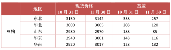 11月北方现货价格较10月基本持平,而南方略有上涨。但由于盘面上涨,基差除华南外,均较10月有所回落。