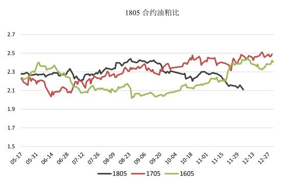 油粕比:11月国内豆粕现货购销两旺,油厂在高榨利背景下维持高开机率,豆油便成为了高榨利的牺牲品。其库存不断新高,压制油粕比持续走低。1801合约油粕比在11月跌破到2.00的水平,1805跌至了2.10左右。印度上调也对油脂需求不利。因此油粕比只有在跌至极值水平时,随着国内豆粕需求减弱,开工率下降时才可能有所回归,空间也仅看到今年以来的中轴水平2.20-2.30。操作上,跌至极值可以少量参与,达到目标位及时平仓。