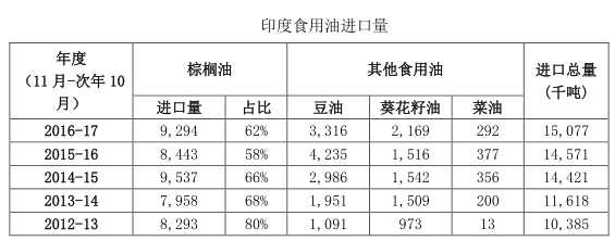 印度溶剂萃取商协会(SEA)发布的数据显示,印度10月食用油进口量为113.41万吨,由去年11月开始的16/17年度至此也已结束。该年度印度合计进口食用油1507.7万吨,其中棕榈油(包括毛油、精炼等)进口929.4万吨,占食用油进口总量的62%。其他品种上,豆油进口331.6万吨,葵花籽油216.9万吨,菜油29.2万吨。