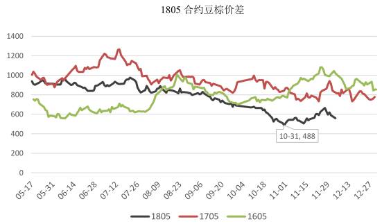 豆棕价差:1801豆棕价差一度拉大至580元,原因不是豆油变强,而是棕榈油更弱。印度上调的影响还需要进一步跟踪,到目前看是对棕榈油最为利空。1805豆棕价差在620元,较1801高近100元,这个价差入场并没有太高的安全边际,只有在价差在500元左右,或者切实看到豆油基本面改善时才有操作的空间。