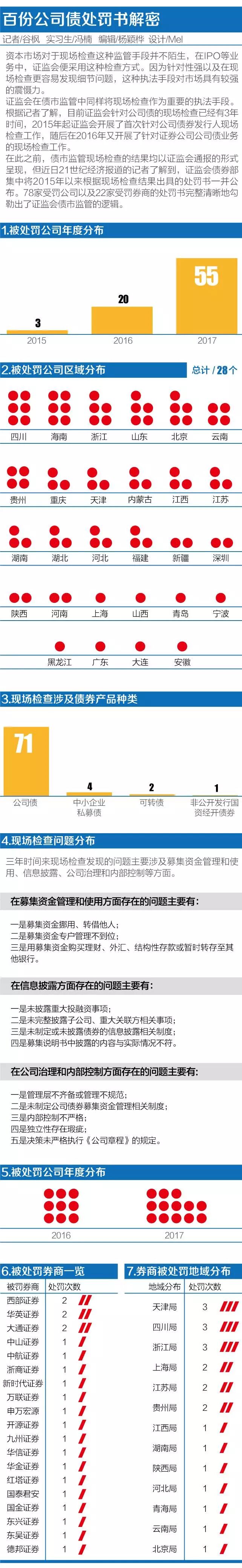 根据21世纪经济报道记者的梳理,此次债券部公开的根据2015、2016、2017三年现场检查结果处罚的企业共达78家。