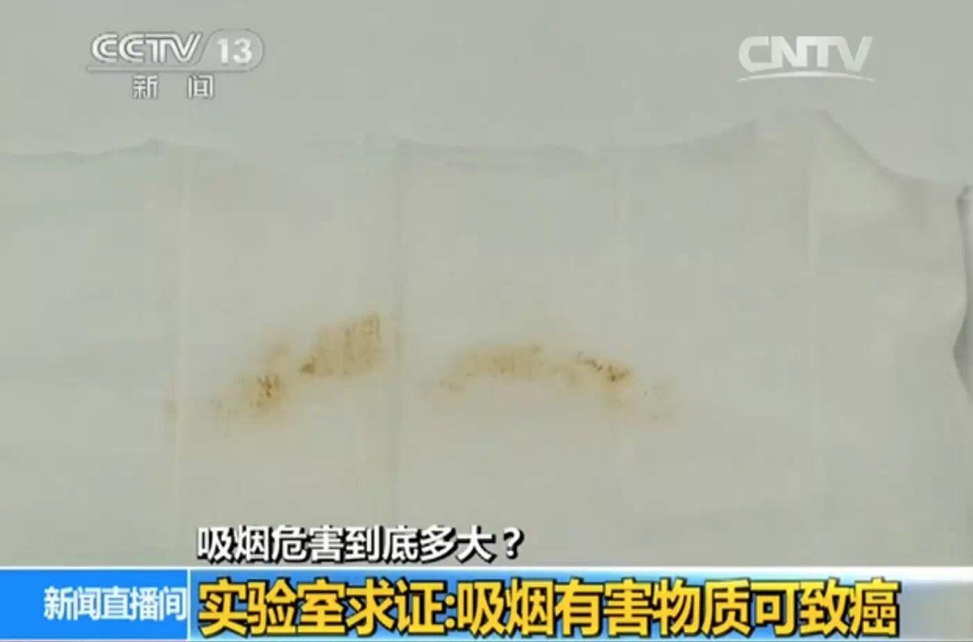 实验中,测试人员先在香烟上安装了一个过滤嘴,之后开始吸烟,并将烟吐在一张干净的湿纸巾上。