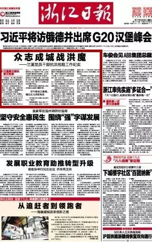 《民生6+1》记者徐超参与采集整理的抗洪典型事例被6月28日的《浙江日报》头版头条采用。