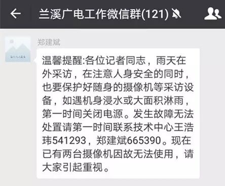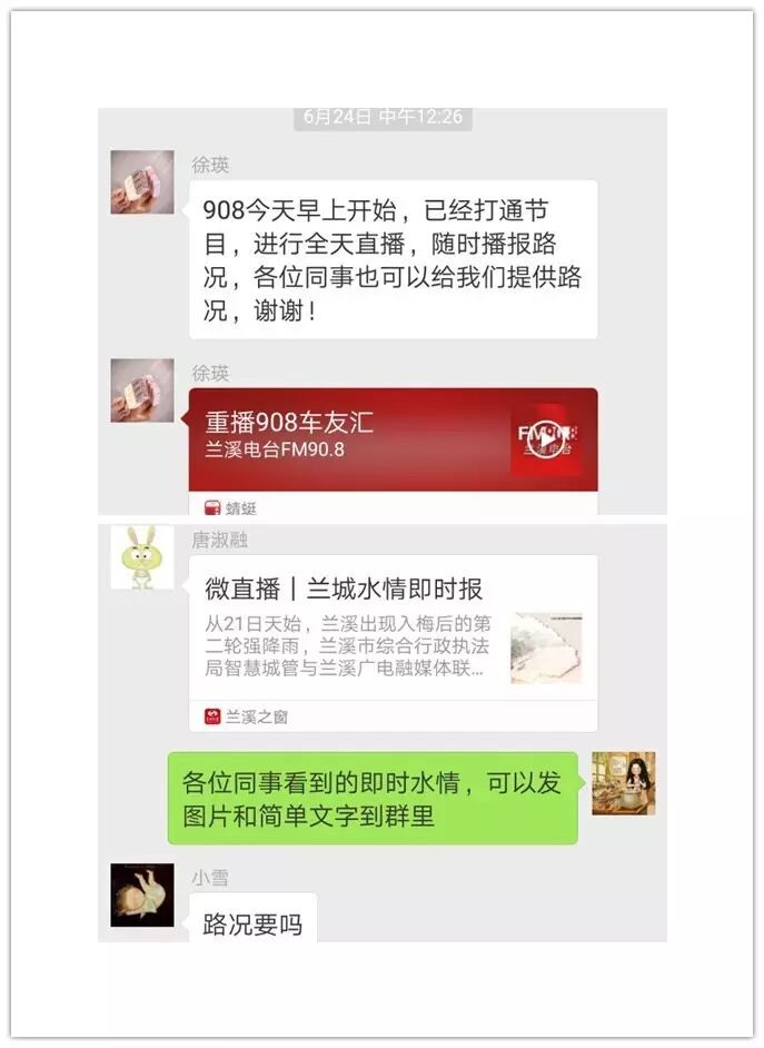 汛情就是命令。虽然是星期六,台党委书记、台长芦建洪马上在广电工作微信群发布应急响应命令,“@所有人,中层以上收到请回话,马上开会”。全台就紧急动员起来了。