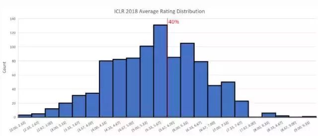 根据 Andrej Karpathy 的介绍,在今年 4 月的 ICLR ,提交论文的数量为 491 篇,而被接受的情况为:15 篇 oral(3%),183 篇 poster(37.3%)。所以上图中我们给出了 40% 的接收线作为参考。