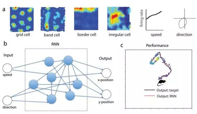 a)为样本神经数据表示 EC 空间导航任务中不同神经关联性。b)中的循环网络由 N = 100 个循环单元(或神经元)组成,它们接收两个外部输入,即代表动物的速度和方向。c)为训练后的典型轨迹,RNN 的输出可以精确地在导航期间追踪动物的位置。