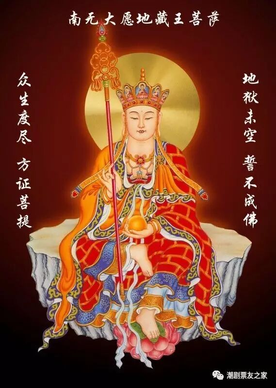 慈因积善,誓救众生,手中金锡,振开地狱之门。掌上明珠,光摄大千世界。智慧音里,吉祥云中,为阎浮提苦众生,作大证明功德主。大悲大愿,大圣大慈,。