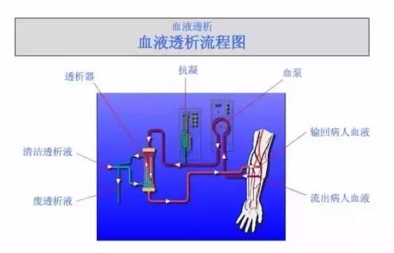 它通过将体内血液引流至体外,经一个由无数根空心纤维组成的透析器中,血液与含机体浓度相似的电解质溶液(透析液)在一根根空心纤维内外,通过弥散/对流进行物质交换,清除体内的代谢废物、维持电解质和酸碱平衡;同时清除体内过多的水分,并将经过净化的血液回输的整个过程称为血液透析。