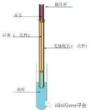 移液器的工作原理:活塞通过弹簧的伸缩运动来实现吸液和放液。