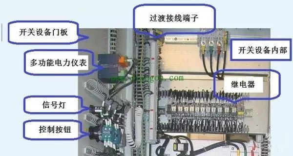 从图中我们看到柜内的各种开关电器,还有门板上的控制按钮、信号灯和多功能电力仪表。多功能电力仪表的电流信号线就来自于电流互感器。