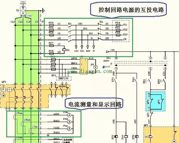 在这里,我们看到了三个电流互感器,符号是1TAa~1TAc,还看到三个电流表,符号是PAa~PAc。电流表一般安装在开关设备的门板上,而电流互感器则安装在开关设备的内部。因此,在布线时就必须考虑到活动连接的问题。
