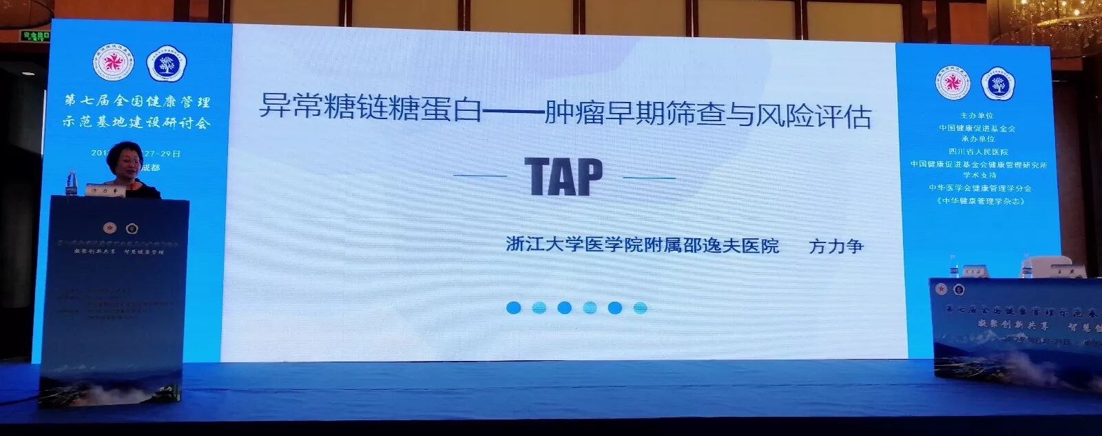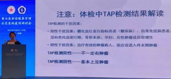 在本次研讨会上,方力争教授作为浙江省“异常糖链糖蛋白TAP肿瘤筛查多中心研究”课题组的组长,作了关于“异常糖链糖蛋白TAP——肿瘤早期筛查与风险评估”的学术报告。体检中的肿瘤筛查是肿瘤早发现的重要途径,目前体检主要依赖影像学和内镜、肿瘤标记物等肿瘤专项检查。肿瘤标志物是肿瘤早期发现的主要手段,但现有肿瘤标志物敏感度和特异性低、可检测肿瘤种类少。异常糖链糖蛋白TAP是“细胞变异的分子行为学指标”,是在出现“肿瘤组织”以前、发生“细胞/蛋白”生物分子变化,从细胞膜表面脱落到血液中的几十种糖链结构异常的糖蛋白,是“肿瘤早期发现和风险评估”的重要手段,具有灵敏、广谱、准确的优势。TAP检测用于体检人群的肿瘤筛查,与常规肿瘤标志物相互补充综合分析提高准确性,降低肿瘤漏检。TAP检测用于体检慢病和异常病症的肿瘤风险评估,可实现早筛早诊。