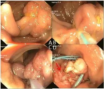 图 11 横结肠长蒂息肉,采取预置钛夹法切除息肉,圈套过程中,视野不清将预置钛夹一并套入,由于钛夹的导热作用,切除后可见(D 图)中变形残蒂和周围灼伤粘膜(红色箭头)。此前笔者未曾预料此并发症发生,未行追加封闭处理。术后 5 小时后,患者腹痛,腹涨,腹平片示少量游离气体,经抗炎、抗生素、营养支持等保守治疗三天后,症状消失