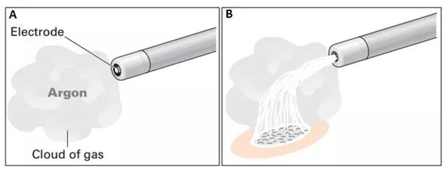 图 22 APC 治疗原理图 A. 高频电流以单极技术产生电离的氩气电子云;B. 氩等离子体无接触情况下即可对靶组织产生凝固效应1