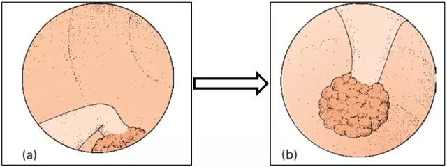对于直径接近于2cm 的 IIa-c 型病变及部分 Is 病变,若直接圈套切除,可能造成全层损伤,通过黏膜下注射液体可增加病变隆起高度,减少圈套和切除难度(图 15,16,17)。而术中是否具备隆起症,又是确定腺瘤良恶性和有无内镜下治疗指征的一个重要依据。此方法能增加直径<2 cm 腺瘤的完整切除率。
