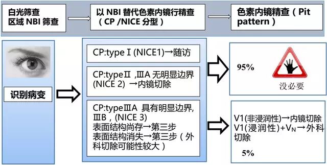 从流程中不难看出,该方案遵循了「白光内镜是基础,放大和色素内镜锦上添花」的原则,在第一步完成了基本病变的识别,第二步中完成了对 95% 病变(非浸润癌)的判断,在第三步中,只有 5% 的病变才进行复杂的放大和染色操作。