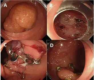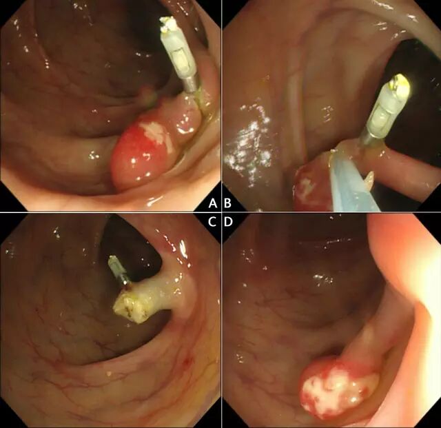 图 10 降结肠长蒂息肉,预置尼龙绳后,实现安全切除。D 图红色箭头为巨大息肉接触肠壁,切除过程中形成灼热伤