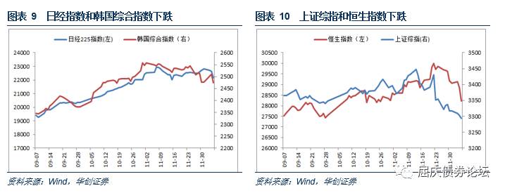 第三,受朝鲜半岛局势升级影响,市场避险情绪大增。11月29日,,,,韩国此前宣称将于12月4日至8日举行代号为“警戒王牌”的联合军演。,。针对此次军演,朝鲜方面也于12月3日称“联合空中军演是对朝鲜的严重挑衅,朝方正慎重考虑采取史上超强硬措施,以期让对方付出代价。” 维持两个月相对平静时期的朝鲜半岛局势再度趋于紧张,,全球避险情绪升温,美元兑韩元汇率连续上涨,韩国综合指数及亚洲三大股指纷纷下跌,国内债市受避险情绪影响或有小幅提振。但是考虑到未来朝鲜局势发展存在较大的不确定性,以及目前实际发动战争可能带来的潜在影响过大,情绪层面难以对市场带来实质利好,密切关注后续进展。