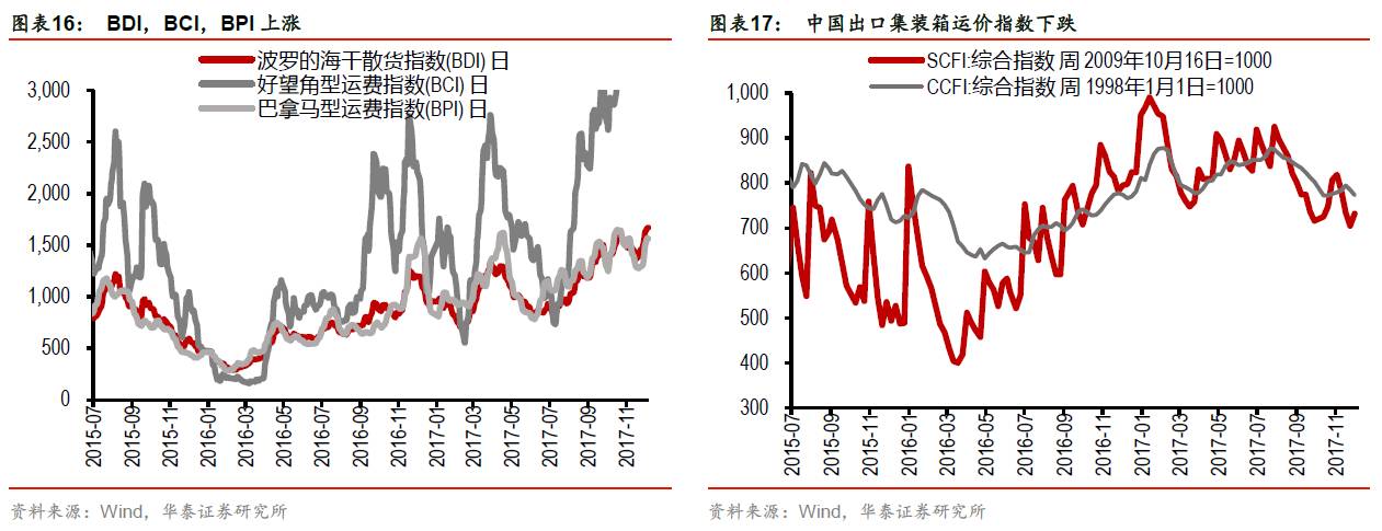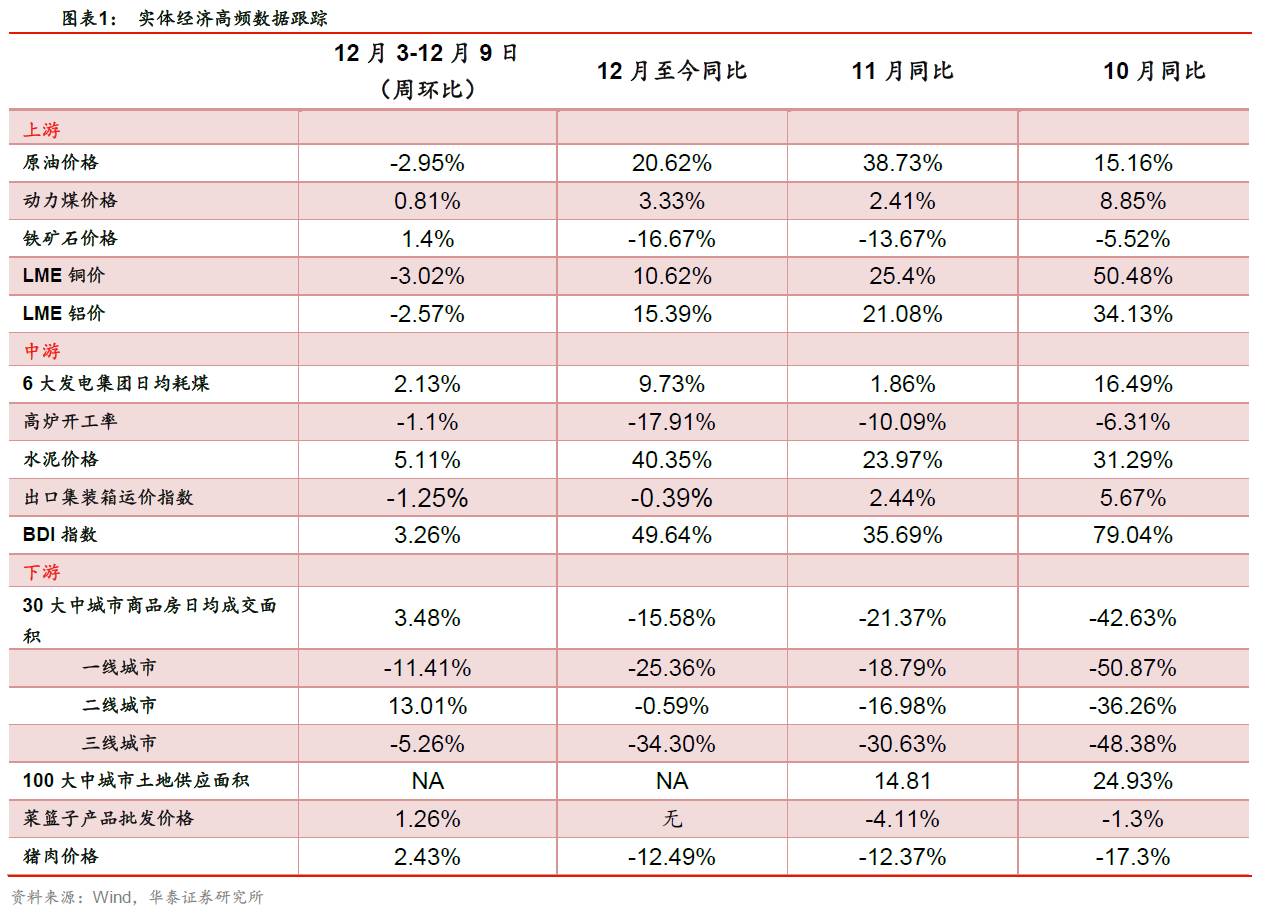 本周菜篮子指数、农产品价格指数环比分别上涨1.26%和1.08%。6大发电集团日均耗煤环比上涨2.13%,高炉开工率环比下降1.1个百分点;中国出口集装箱运价指数下跌1.25%,BDI指数上升3.26%。商品现货方面,原油价格下跌2.95%,铁矿石价格上涨1.4%,水泥价格上涨5.11%。期货价格方面,铜价环比下跌3.02%,铝价下降2.57%,焦炭、焦煤和螺纹钢价格分别下跌7.47%、10.63%和3.17%,动力煤价格上涨1.65%。