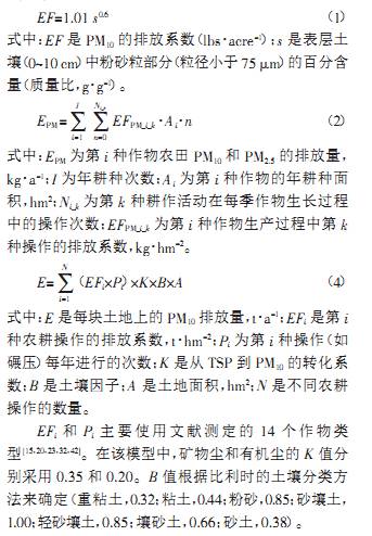 上述三种方法中,AP-42仅考虑了土壤类型(以粉砂粒含量计),而CARB和EEA方法尽管考虑了农耕操作的排放系数,但是没有考虑土壤类型。因此,比利时科学家在预测佛兰德斯地区农田总悬浮颗粒物(TSP)和PM10排放时将两种方法融合起来(参见下文公式3)。此外,Penfold等直接将AP-42方法和CARB方法结合开展了美国中部地区农业耕作操作的大气颗粒物排放清单的编制工作(参见下文公式4)。