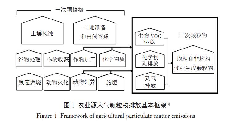 如图1所示,农田的悬浮颗粒物排放主要是农田风蚀、田间耕作和作物收割过程中一次源排放。根据粒径组成,悬浮的颗粒物主要部分是沙粒(空气动力学直径大于20 μm)、尘粒(直径20 μm以下)、粉尘(直径小于10 μm,又称PM10)。农田风蚀主要是在自然风力下发生的,而田间耕作和收割属于机械扰动,会使土壤颗粒崩解及夹带而悬浮到大气中,特别是粒径小于10 μm的颗粒物。这些颗粒物主要是由土壤源矿物质和植物源有机质粉尘形成的组合成分。颗粒物越细,其在低空大气中的停留时间越长,传输也越容易。目前的研究开始着重关注农田表层土壤所释放的细颗粒物,无论是在农田耕作区域内或者区域之外的地区。这是因为大量的养分、有机质和其他土壤组成(比如杀虫剂和污染物)能结合或者吸附在细颗粒物上,与表层土壤总量相比,这些成分在细颗粒物中的含量可能要比其他部分高出10倍。其次,来源于农田的颗粒物包含了许多微生物,例如病毒、细菌、线虫和孢子等,这些微生物可能会随着颗粒物被输送到很远的地方。另外,农田风蚀产生的细颗粒物排放在一年之中可能会持续发生。