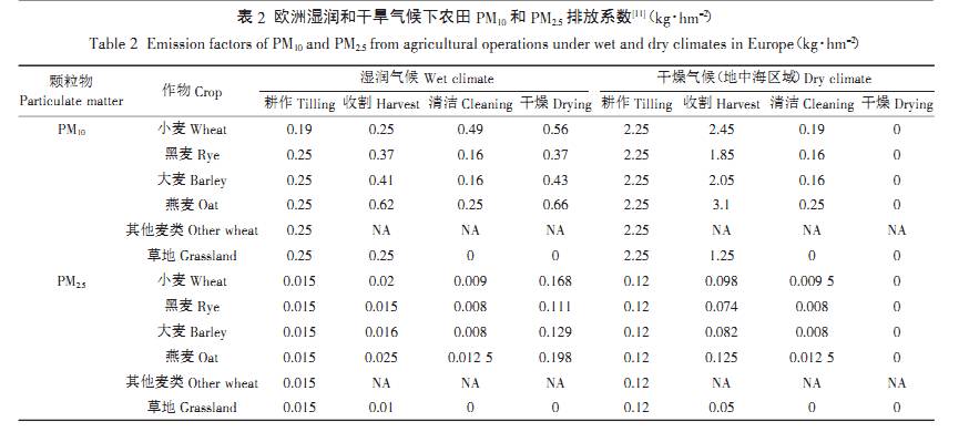 欧洲环境部近10多年也对排放清单开发比较重视,进行了大量排放系数的测定工作,并于2009年专门组织编制了排放源清单开发指南。欧洲农业颗粒物排放清单指南中发布了3级(层次)评估方法。该指南中,农田颗粒物排放量同样是作物种植面积和耕作对应排放系数的乘积,具体每级简介如下。一级:采用默认的排放系数。PM10的排放系数为1.56 kg·hm-2, 95%置信区间为0.78~7.8 kg·hm-2。PM2.5排放系数为0.06 kg·hm-2,95%置信区间为0.03~0.3 kg·hm-2。当作物农田不是重要排放源,且没有直接测定数据时,采用该方法提供的默认值。二级:采用测定后发布的经验系数,这是目前应用最广泛的方法。该方法是基于田间测定后所得到的经验值。具体排放计算见下文公式2;发布的农耕操作排放系数见表2。三级:采用具体地区实际观测到的排放系数(实际测量法)或者基于过程模型模拟出来的排放系数。由于考虑实际气候条件和农耕操作,如果有具体地区直接的测定数据,编制清单时要尽可能用这些数据来估算颗粒物排放量。具体地区的排放系数也同时应用在不同耕作措施(免耕和保护性耕作等)控制颗粒物排放的研究中。