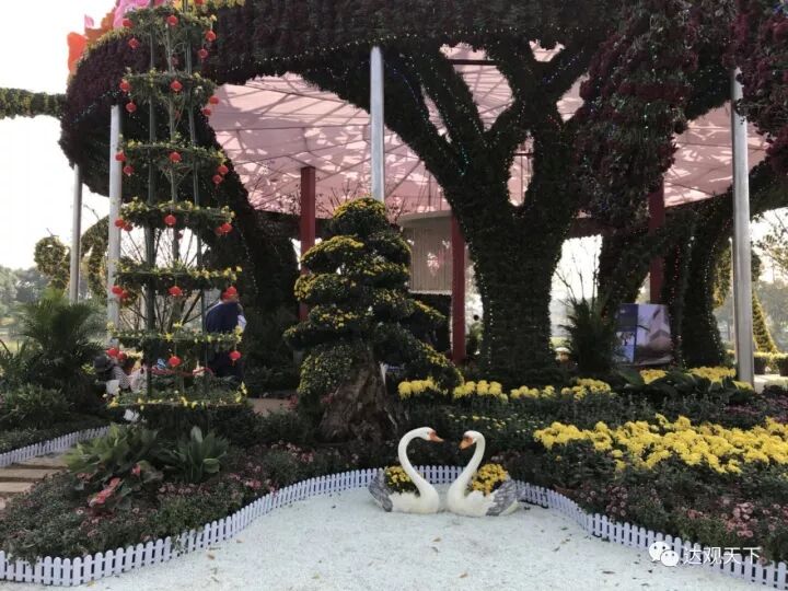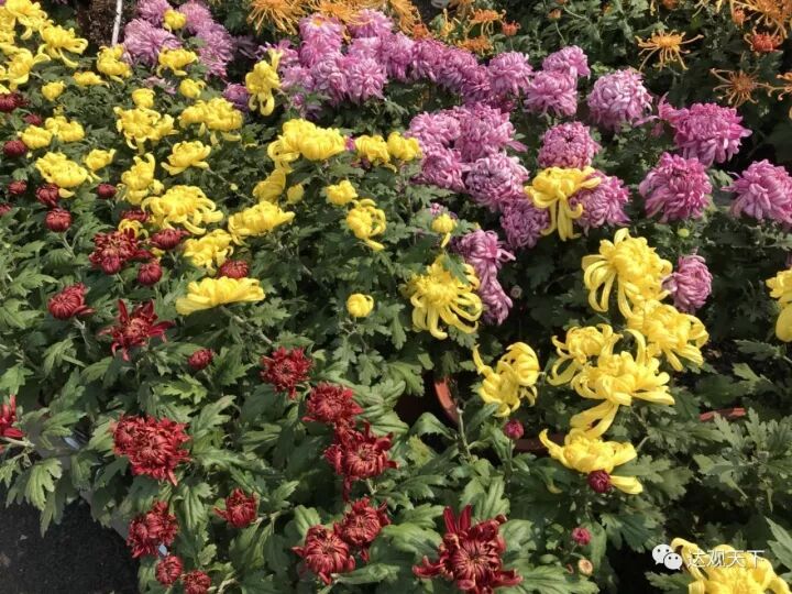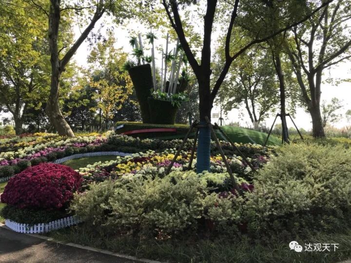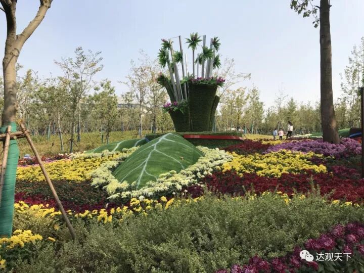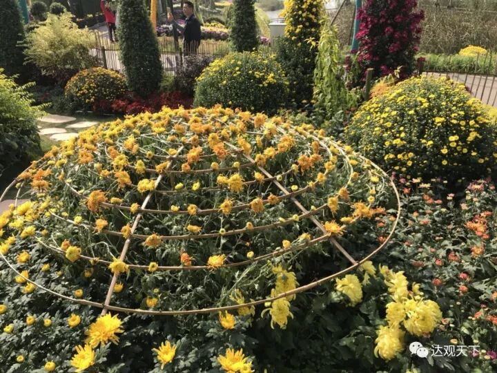 赏菊展区花卉集中在公园中,上百个品种的菊花一起盛放,色彩叠加错落,团团锦簇。菊展的主体为一个高达17米,直径达8.5米的3D光立方大花篮。
