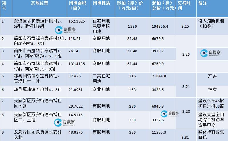 随后2月24日,龙泉驿区一宗48.8亩商服用地计划于3月17日挂牌上市;27日郫都区团结镇、犀浦镇两宗土地上市,计划于3月21日拍卖。