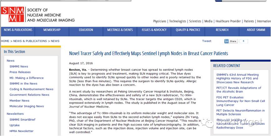 图2.JNM 官方网站对北京肿瘤医院核医学科研制的99mTc-Rit进行的报道