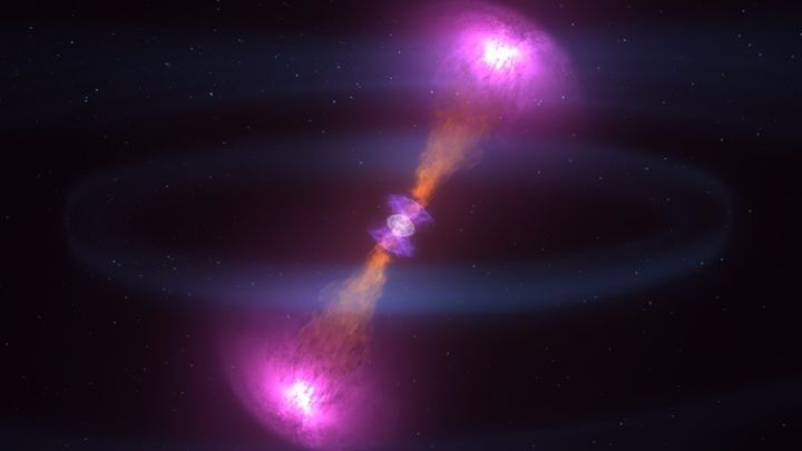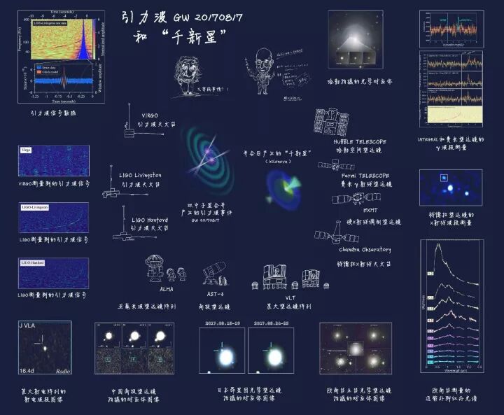 在双中子星合并之前,周围的气体很可能也已消耗完毕。然而,合并过程当中会有部分物质以接近光速或远低于光速的速度被抛射出去,从而产生我们看到的各种电磁现象——短时标伽马射线暴(简称伽玛暴)、伽玛暴余辉和千新星。接近光速运动的物质产生了费米卫星看到的伽玛暴,而低速运动的物质产生了千新星,被很多的光学/红外望远镜捕捉到。