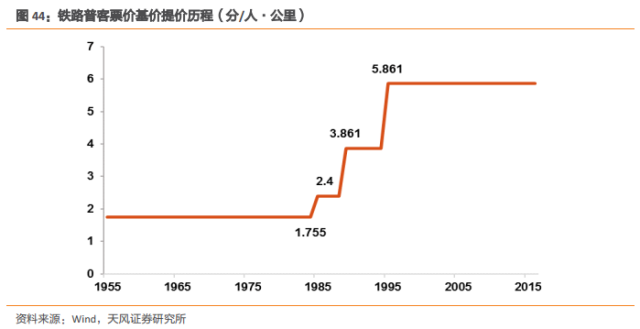 中国铁路普通客运票价基价已经超过20年没有提价,因此我们预计未来涨价空间较大。从1955年至1995年的四十年间,,这个基价从1955年最初的1.755分/人公里涨至1995年的5.861分/人公里,中间经历3次涨幅,均在改革开放之后。但自1995年以后,铁路基价已经近20年没有进行调整,横向相比航空领域对市场化航线定价放开的逐步探索,铁路基价的调整明显严重滞后。