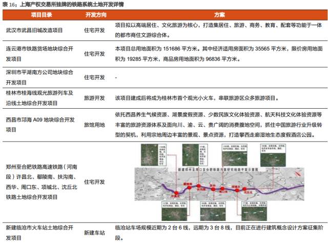 8月8日,中国铁路总公司委托上海联交所,后者与中国铁路建设投资公司联合举办“铁路土地综合开发项目推介会”,对首批铁路土地综合开发项目进行了集中推介。本次推出既有铁路、新建铁路土地综合开发,物流园区经营开发及昆明米轨铁路综合开发等21个项目,涉及土地20552亩。中国铁路总公司、各有关路局和中国铁路建设投资公司相关领导莅临推介会。恒大、万科、碧桂园、华夏幸福基业、中铁建、融创中国、海航地产、龙湖地产等143家房地产开发和投资企业参加了本次推介会。