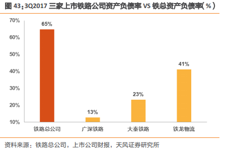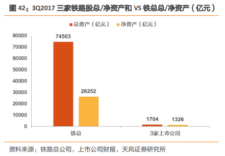 当前仅有大秦铁路、广深铁路以及铁龙物流三家铁路公司实现A股上市,对比整个铁路总公司的资产体量,上市部分的总资产仅占2.3%,净资产仅占5.1%。绝大部分的铁路体系资产尚未实现资产证券化。