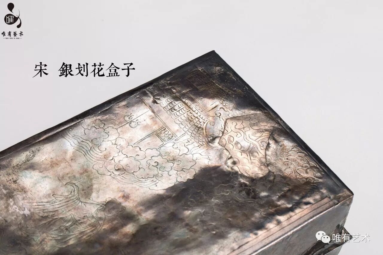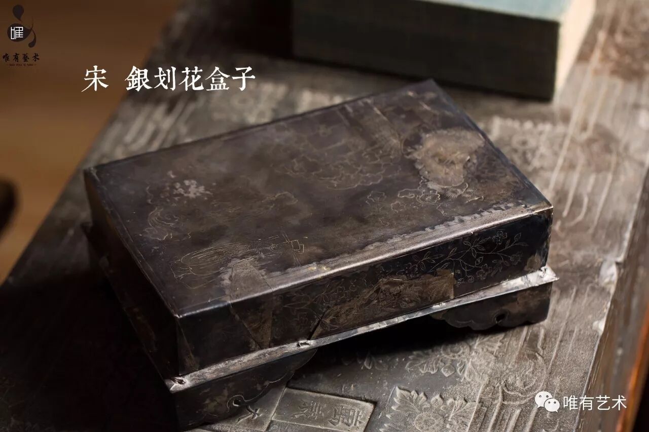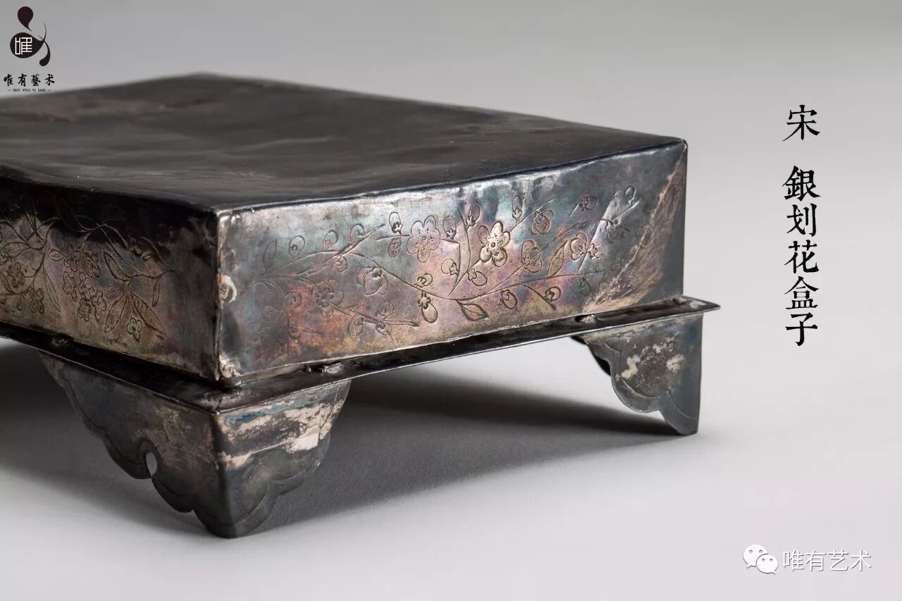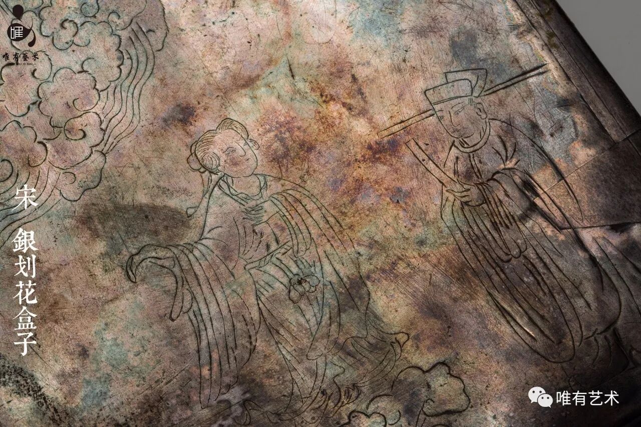 “妆把低声问夫君,画眉深浅入时无”。一方宋代银质妆盒,道不尽闺中情长。此盒面錾刻人物故事,生动形象。盖四壁刻绘花草叶,流畅灵动。器底承祥云形足,饰以线条。尽显宋之奢华,。。