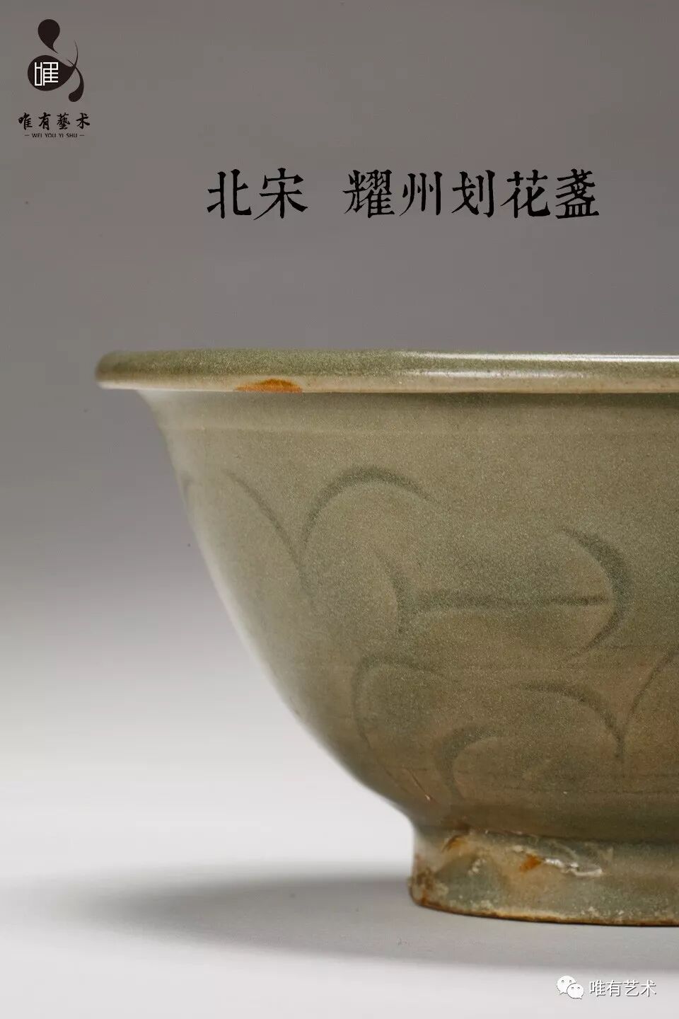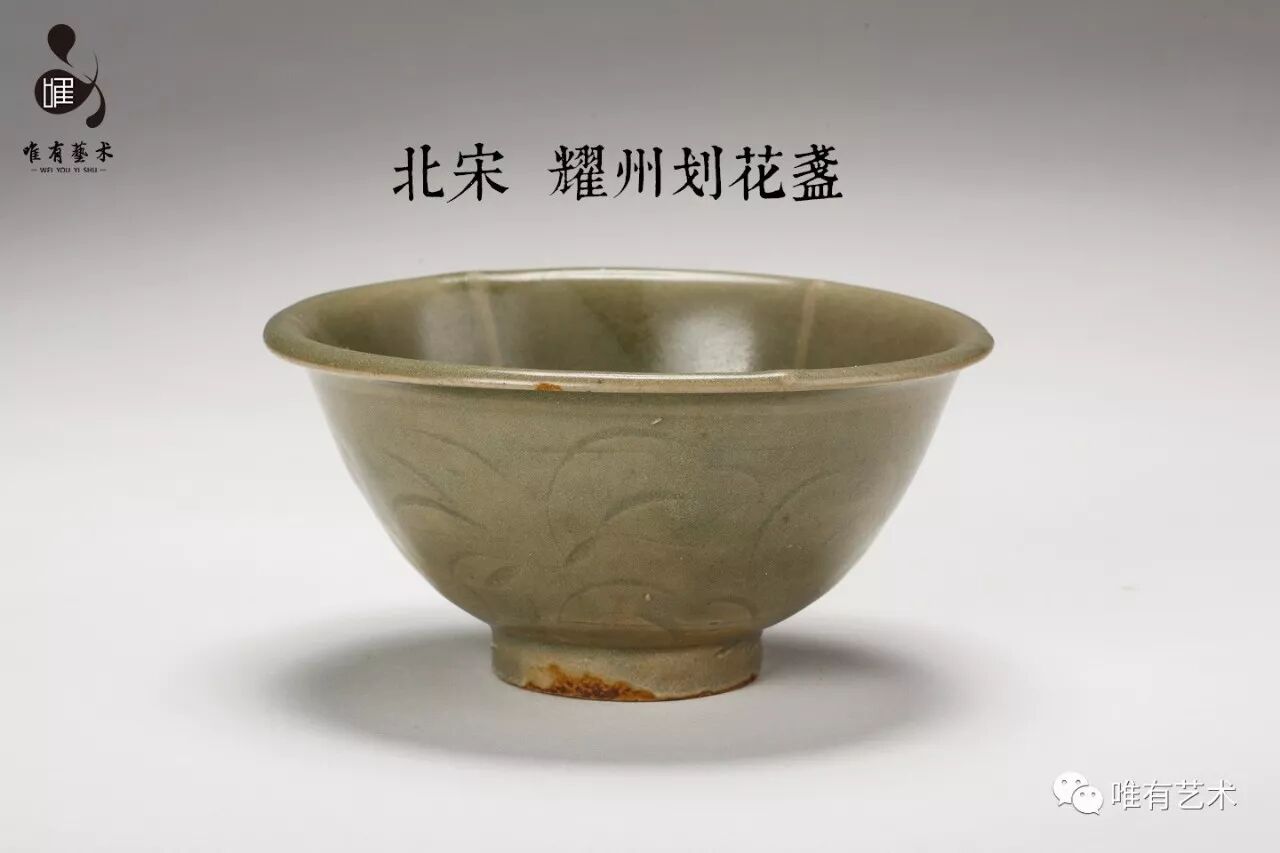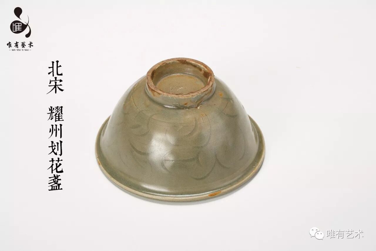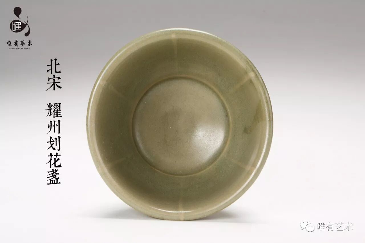 本品外壁斜划律动十足,似花瓣纷飞。内壁光洁匀静,色泽青幽,并有六处出筋。 为早期耀州窑的上乘之作。