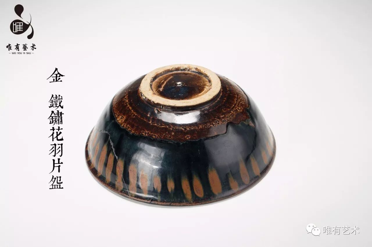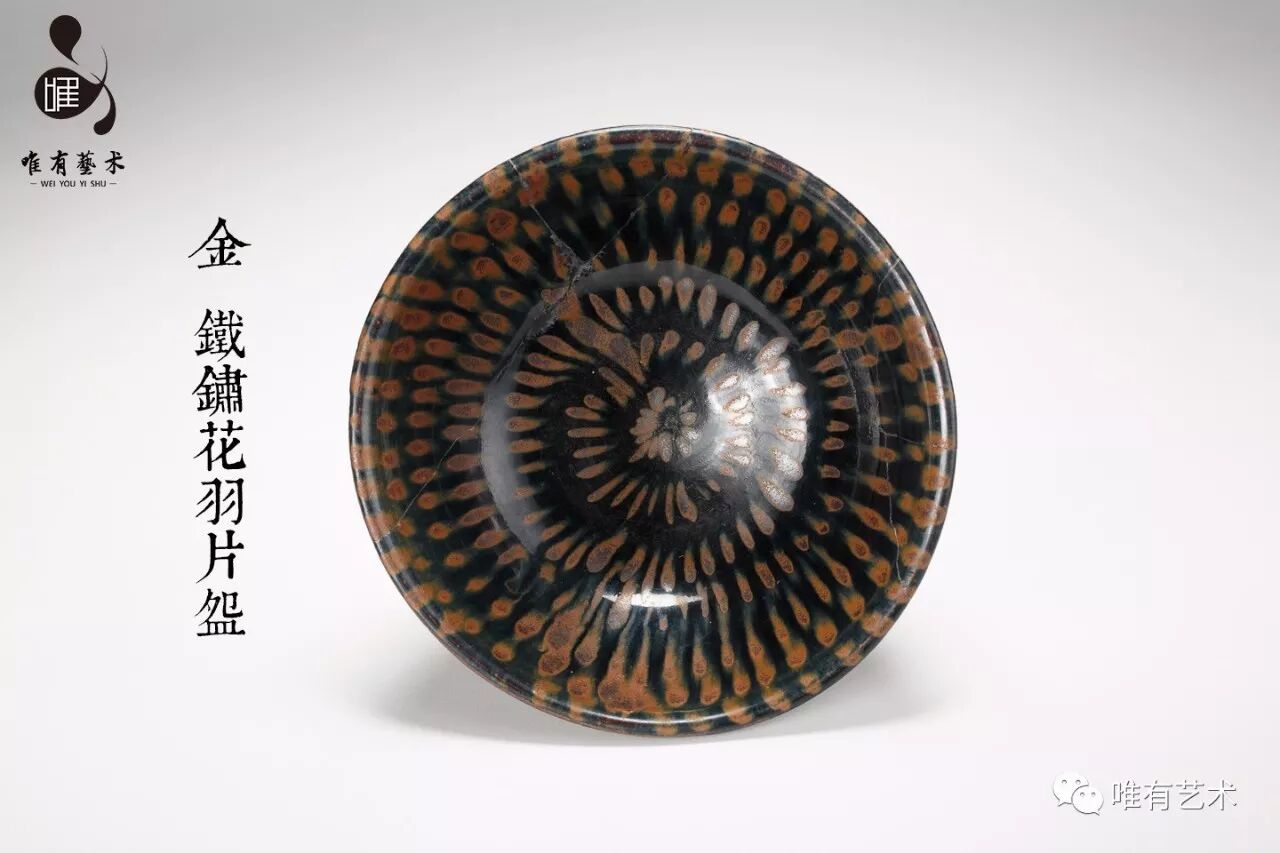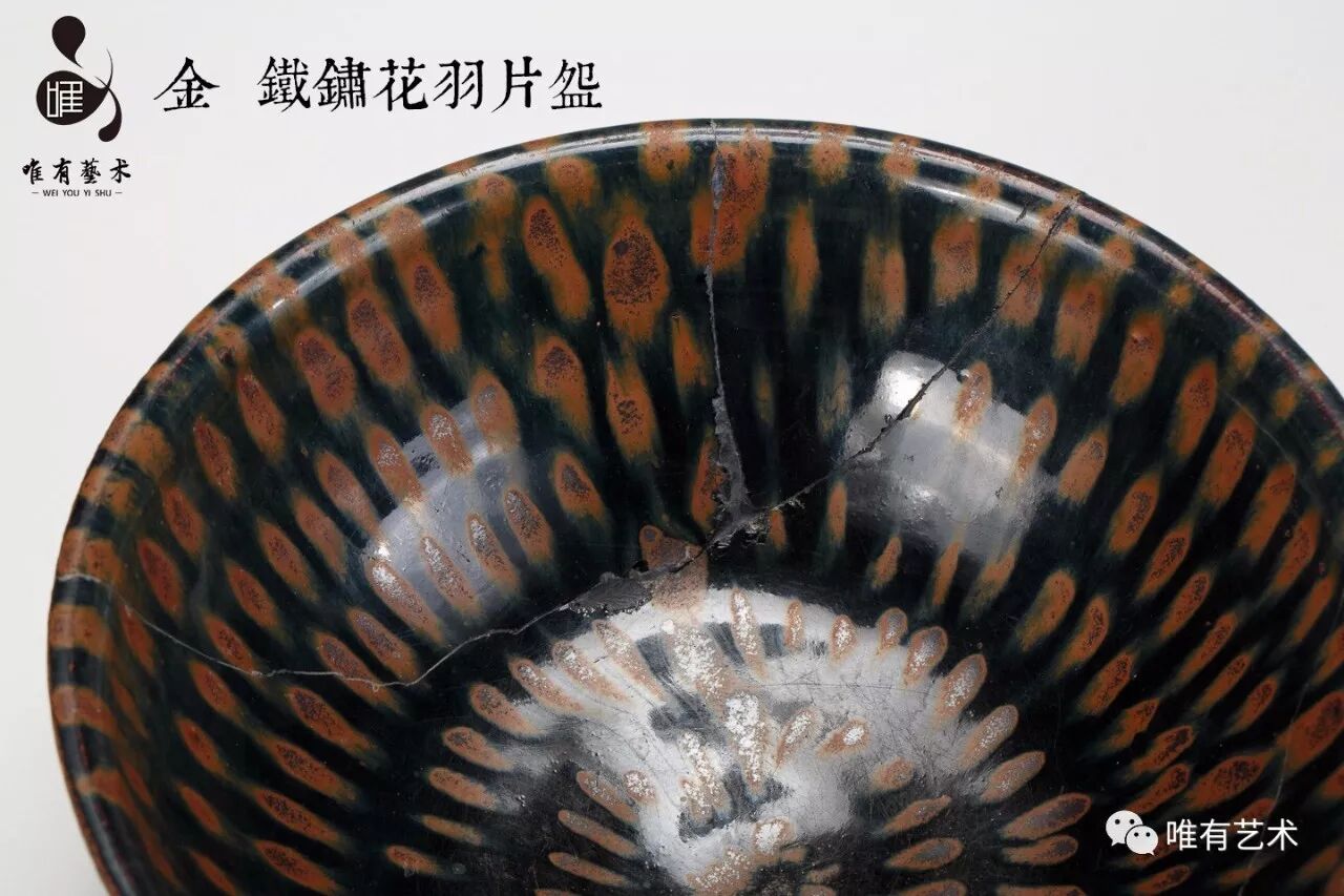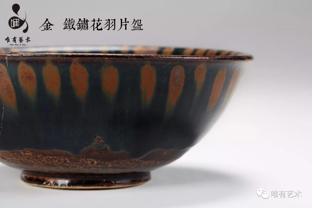此碗内外皆有羽状铁锈花纹饰。层层叠叠,装饰效果极美,视觉效果极强。系出名窑,宫碗样式,釉色一流。惜有三处残拼。并不缺肉。虽残犹珍。