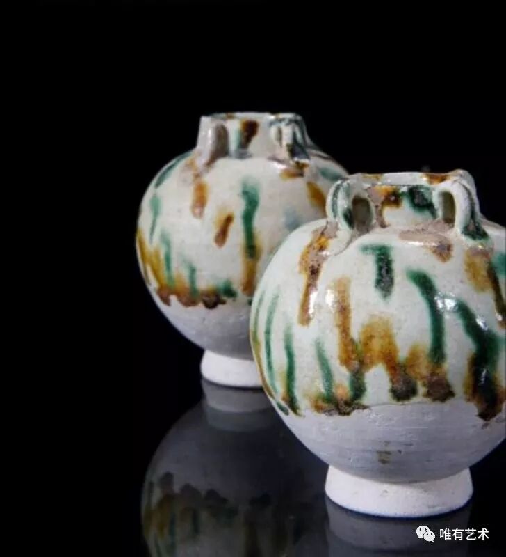 此四系罐直颈口,丰肩,橄榄形腹部,弧线收于底足,肩颈处有四个互相对称的小系,间隔中有圆形的图案,身上黄、绿、白三色釉色自然结合,清新不拘束,气质优雅。