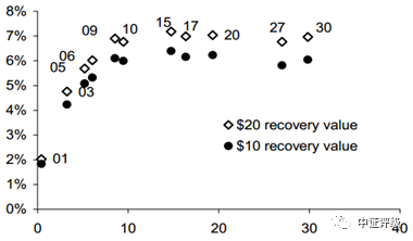 由于模型中假设的回收率与真实的回收率间存在差异,所以计算得到的印但只要保障回收率假设的一致性,那么得到的隐含违约率的相对关系将保持不变,具有可比性。