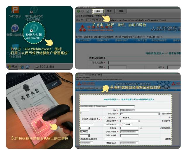 2017年6月22日,在总行的大力支持下,由农行天津分行运营管理部提出立项需求,分行信息技术管理部研发的超级柜台对公开户客户信息一键式录入和人民币银行结算账户管理系统一键式录入系统上线了。该项目以“一键式录入”为亮点,实现了通过扫描二维码填写客户信息的功能。