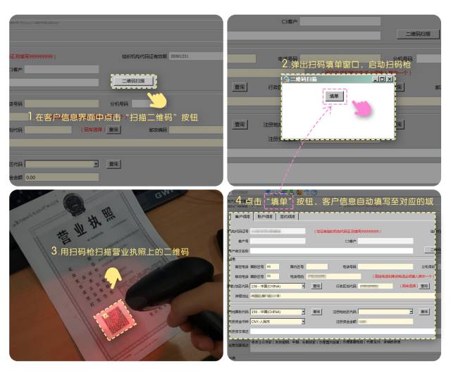 柜员只需在超级柜台开户及签约业务办理界面(或在人民币银行结算账户管理系统)中点击“二维码扫描”按钮(或“监听”按钮),然后使用扫码枪扫描营业执照上的二维码,系统即可自动识别客户信息,并将客户信息自动填写至相应的域中。这样,柜员录入客户信息时间由原来的20分钟缩短至2分钟,柜面操作综合效率提升90%,信息录入准确性达到百分之百。