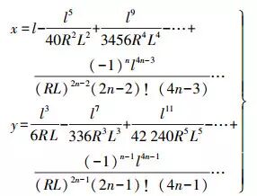 式中,β=l2/2RL;l为任意点到缓和曲线起点的弧长;(x,y) 为任意点在缓和曲线局部坐标系下的直角坐标。由式 (2) 可以看出,缓和曲线是复杂的高次连续曲线,它不能用初等函数表示。对式 (2) 进行数值积分并对式中三角函数进行麦克劳林级数展开可以求解得缓和曲线在其局部坐标系中的表达式,即