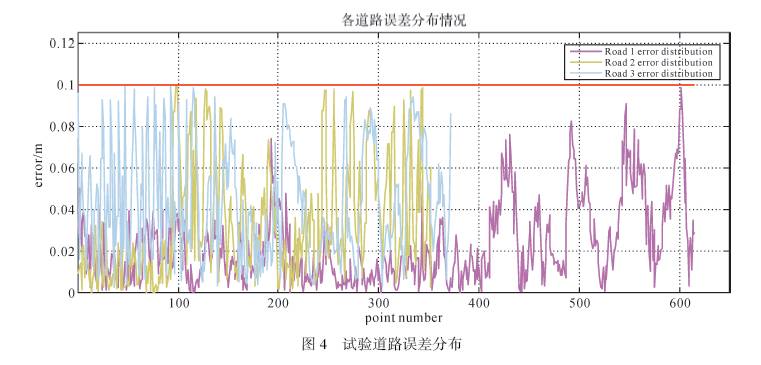 根据上文中的算法,设定分段拟合的最大误差限差为0.1 m,对本文试验数据进行动态分段拟合,拟合结果如图3(b)所示。图4给出了各试验道路的拟合误差分布情况。可见,使用本文算法实现了误差可控。
