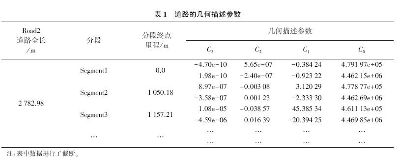 表1给出了Road2几何描述的一段实例数据。对每一分段,使用两个参数三次多项式方程和分段起点处里程s,共9个参数进行数学描述。通过表1中的数据,能对试验道路几何形状进行准确的描述,通过一定的计算能获取道路任意点处完整的几何信息。