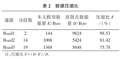 表2是几何表达数据压缩比统计表。可以看到,道路1只使用两个分段就表达了614个形点的几何信息,数据压缩比达到98.53%;形状稍为复杂的道路2,使用14个分段表达了339个形点的几何信息,数据压缩比为81.42%;形状更为复杂的道路3虽然产生了19个分段,也达到了75.78%的压缩比。