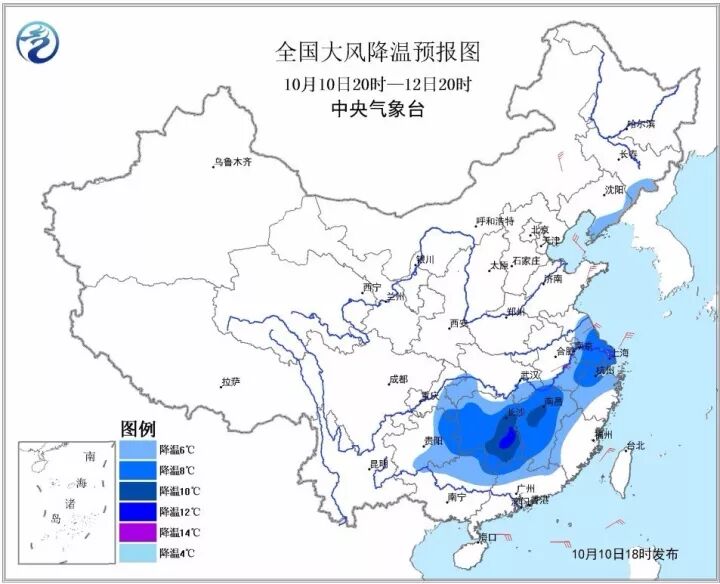 中央气象台预计,较强冷空气继续影响中东部地区,10日20时至12日20时,东北地区南部、江南大部、华南北部、贵州东部等地有6~8℃降温,局地降温可达10~12℃,部分地区有4~6级风。